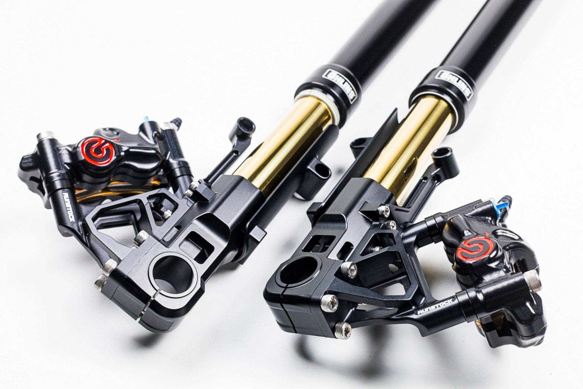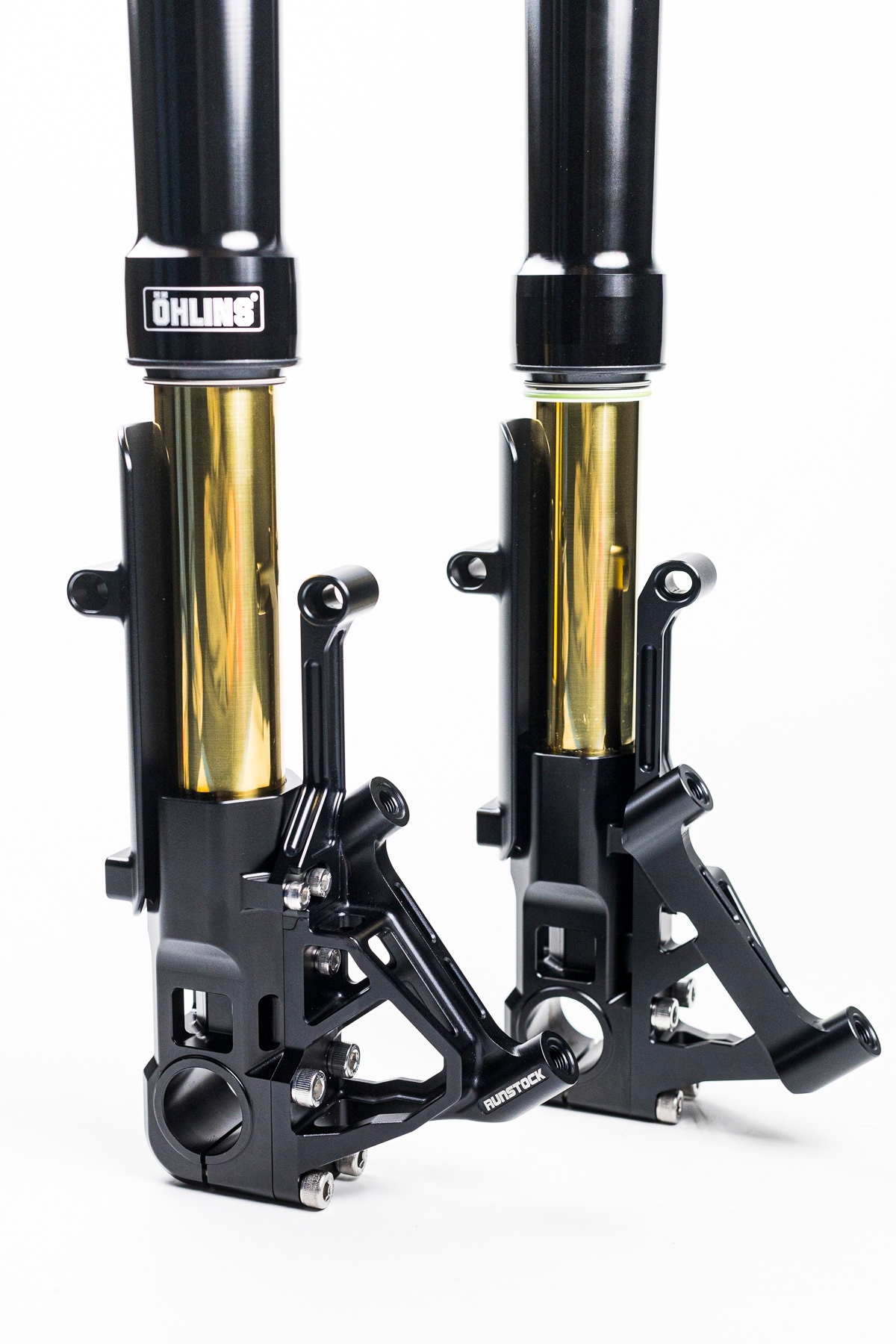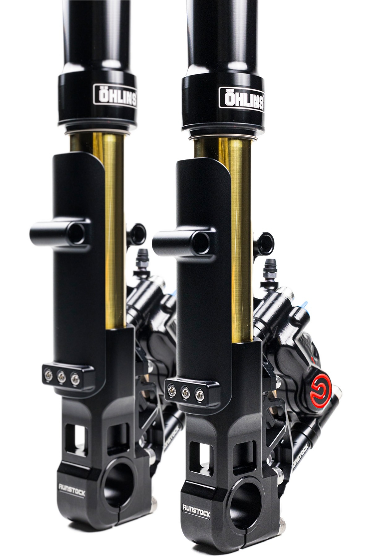 RUNSTOCK ไม่เคยหยุดพัฒนายังคงออกแบบสิ่งใหม่ๆเสมอ ด้วยดีไซน์ใหม่สำหรับชุด Front End ที่จับคู่กับหัวกลับของ Ohlins ในดีไซน์ใหม่นี้เราจะเห็นถึงความคิดใหม่ๆจากทีมพัฒนา ซึ่งดูแปลกตาออกไปจากการออกแบบครั้งก่อนๆ มาครั้งนี้จะเริ่มเห็นการมีช่องว่างของขาจับCaliperมากขึ้น น้ำหนักเบาลงแต่ก็ยังคงความแข็งแรงเหมือนเดิม มีการ์ดป้องกันแกนโช๊คไม่ให้เกิดรอยได้ง่าย